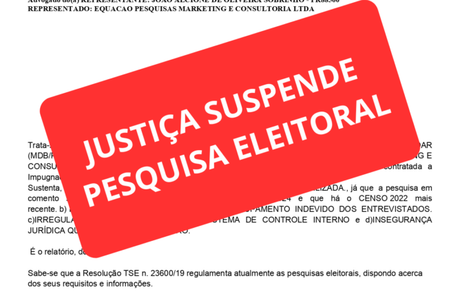 Justiça Eleitoral suspendeu nesta segunda-feira (24) a divulgação de uma pesquisa sobre a intenção de voto dos castrenses, registrada pelo delegado da Coligação Unidos por Castro, que tem como candidato a prefeito Neto Fadel e Jonathan Barros como vice. Em liminar, a Justiça leva em conta possíveis irregularidades na metodologia aplicada pela empresa contratada para fazer a pesquisa.