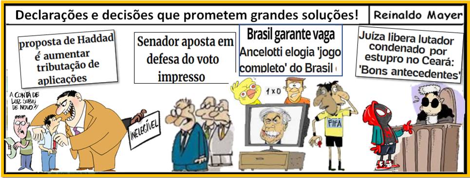 O Brasil vai à luta! Mas qual delas? Canais esportivos elogiaram “a classificação Brasileira para a Copa do Mundo, depois que o sexto lugar nas eliminatórias se transformou num confortável terceiro lugar, faltando duas rodadas para o final. Segundo “Carlito Ancelotti”, a ideia “foi mudar o setor ofensivo e o time empurrou o Paraguai, fazendo um jogo mais completo”(?). Outra distração ficou por conta do depoimento de Jair Bolsonaro no STF: ele e outros militares de alta patente respondem criminalmente num processo que está sendo considerado “histórico”, por “terem planejado um golpe de Estado depois das eleições”. Se até o Ministro Fernando Haddad respondeu as críticas sobre “outro” ajuste fiscal dizendo que “não pensa em aumento de tributos, mas na correção de uma distorção”, o que é possível concluir ? Especialistas dizem que todos estão “viajando na maionese“! E Você? Sobre o que vai opinar? Mas tem “bons antecedentes”? Ou está na luta pelo “voto impresso”?