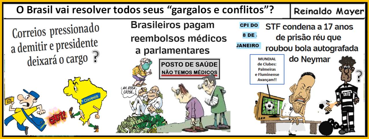 Notícias apontam que “Parlamentares recebem reembolsos médicos, mesmo que tenham acesso irrestrito a Planos de Saúde e à Rede Hospitalar privada”. E o Governo Federal? “Decidiu ingressar com uma Ação no STF, para manter o aumento do IOF”! Mas o STF também decide resultados para outros “grandes julgamentos”: Um empresário foi condenado a 17 anos de prisão, “por furtar uma bola de futebol que estava no Palácio do Planalto, na invasão do dia 8 de janeiro”. Ela foi assinada pelo Neymar”! Como estas notícias estão circulando? Pela Internet, uma vez que a Empresa Brasileira de Correios e Telégrafos, vinculada ao Ministério das Comunicações, “sofre pressão do Palácio do Planalto para demitir 10 mil funcionários e vender imóveis do seu patrimônio”! O Presidente dos Correios não quer adotar as medidas? O Legislativo garante: vai analisar “gargalos e conflitos que surgirem”! E as Luzes, Câmeras e Ações? Irão para o STF! Mas, o Brasil, para onde vai?