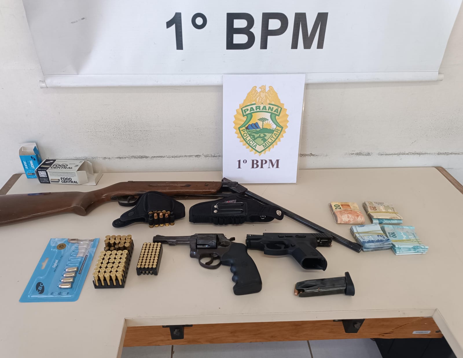 Durante as diligências, os agentes localizaram grande quantidade de drogas, armas e dinheiro em espécie. Foram apreendidos 680 gramas de crack, 890 gramas de murruga, 708 gramas de maconha, um revólver calibre .38, um revólver calibre .32, uma espingarda calibre .22, uma pistola calibre .380, além de 120 munições de diversos calibres.