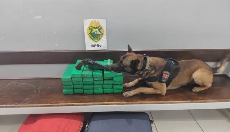 Guarapuava — Durante a madrugada desta sexta-feira (11), operação com cães da Polícia Militar Rodoviária (PMPR) resultou na apreensão de 27,6 kg de maconha e um revólver calibre .38 no pátio do posto Panorâmico, na região de Morro Alto, em Guarapuava. Um adolescente de 17 anos foi detido após o cão de detecção Maximus localizar a droga no bagageiro de um ônibus da empresa Catarinense, que fazia o trajeto de Foz do Iguaçu (PR) a Florianópolis (SC).