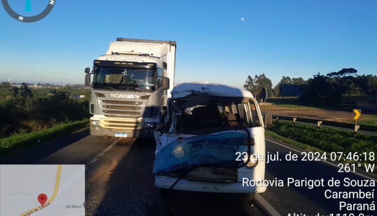 Os veículos envolvidos foram identificados como sendo uma Scania R440, placas de Ponta Grossa; SR/Facchini, placas de Ponta Grossa; VW Kombi, placas de Ibiporã e M.B 1513, placas de Carambeí.