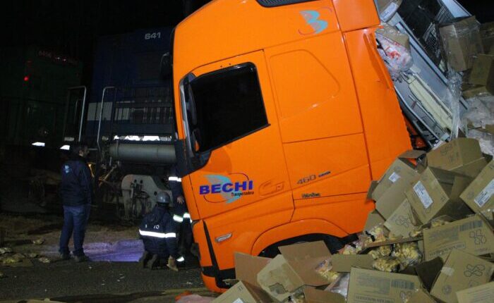 Acidente entre trem e caminhão frigorífico interdita rua e termina com saque de carga em Ponta Grossa
