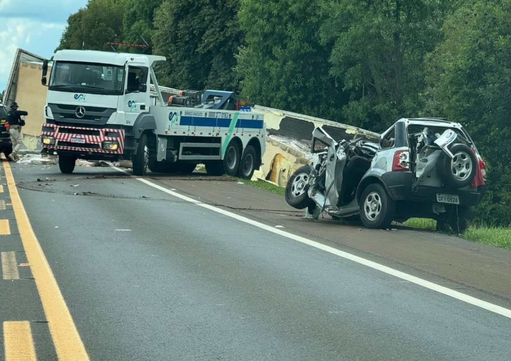 O sinistro envolveu uma colisão frontal, seguida de nova colisão frontal e saída de pista, envolvendo três veículos: um Ford Ecosport prata, com placas de Uberaba (MG); um Renault Kwid branco, emplacado em Foz do Iguaçu (PR); e um caminhão Volvo, carregado com frango.