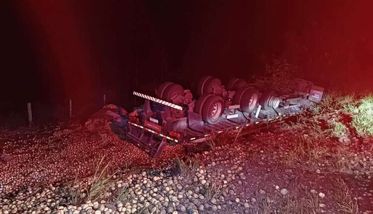 Equipes da Polícia Rodoviária Estadual (PRE) e da concessionária EPR estão no local realizando o destombamento do caminhão e a remoção da carga. O acidente ocorreu quando o motorista trafegava no sentido Sengés à Jaguariaíva e perdeu o controle do caminhão ao atingir o km 180+400 metros. O motorista, identificado como A.O.C., de 27 anos, sofreu ferimentos e foi encaminhado ao Hospital Municipal de Sengés para atendimento médico.