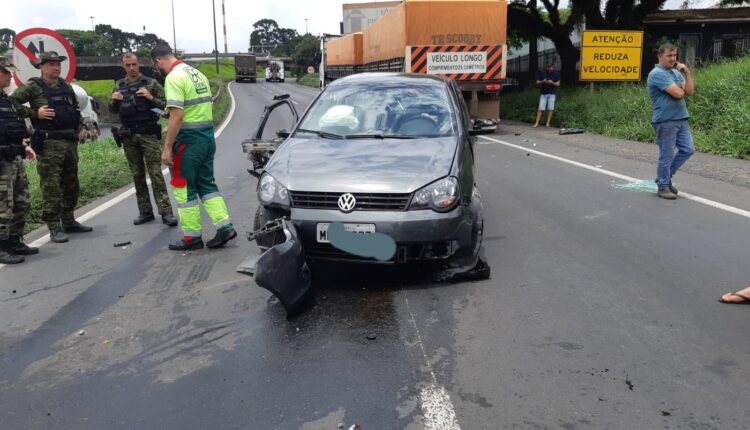 Ponta Grossa – A Polícia Rodoviária Federal (PRF) atendeu, nesta quinta-feira (26), um acidente envolvendo três veículos no quilômetro 488 Norte da BR-376, próximo ao acesso à PR-151. O sinistro ocorreu quando o condutor de um VW Polo, com placas de Joinville/SC, entrou de forma inesperada no referido acesso e colidiu com um caminhão Scania. Após o impacto inicial, o veículo foi jogado para o lado e colidiu contra outro caminhão Scania.