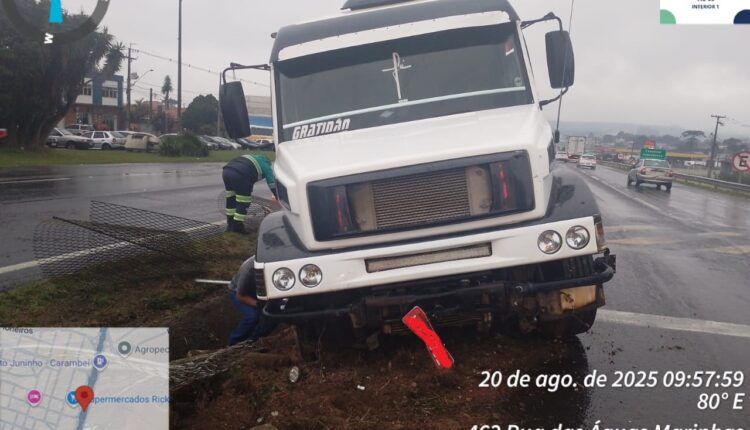 (ASSISTA AO VÍDEO) Motorista perde o controle e caminhão vai parar no canteiro central da PR-151 em Carambeí
