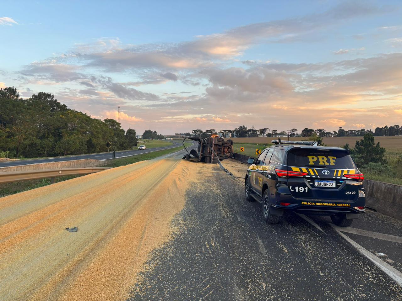 Parte da carga de soja permaneceu espalhada sobre a pista, o que ainda exige trabalho de retirada por equipes no local. Por conta disso, o fluxo segue operando em apenas uma faixa.