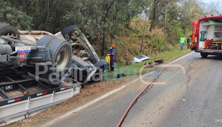 Telêmaco Borba – Grave acidente registrado na tarde desta quinta-feira (24) resultou na morte de caminhoneiro no trecho da PR-160, entre Telêmaco Borba e Curiúva. O caminhão Volkswagen 19.320 estava carregado com sucos de garrafa quando tombou e saiu da pista, ficando com a cabine completamente destruída. O condutor ficou preso às ferragens e não resistiu aos ferimentos. A situação foi registrada pouco após às 13 horas, na região de Harmonia.