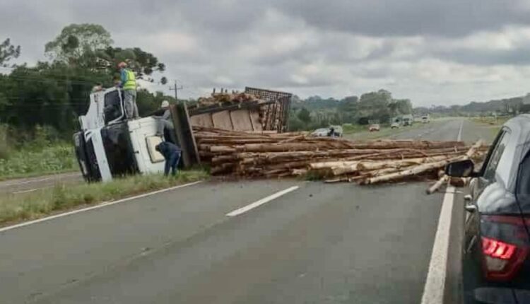 Castro – O tombamento de um caminhão carregado com toras de madeira causa transtornos na PR-151, na manhã desta quinta-feira (20). O acidente aconteceu no trecho entre Castro e Carambeí, próximo à churrascaria Beira Rio, e espalhou a carga na pista contrária, provocando interdição temporária.