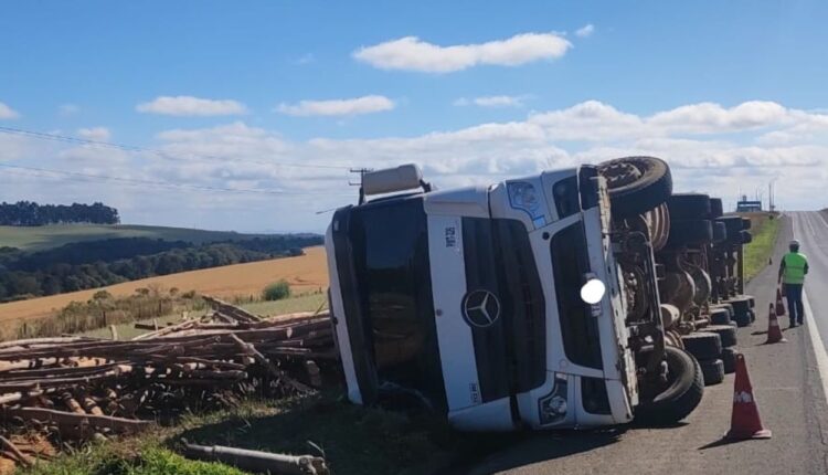 Caminhão carregado de toras tomba na PR-151 em Sengés; motorista sofre ferimentos leves