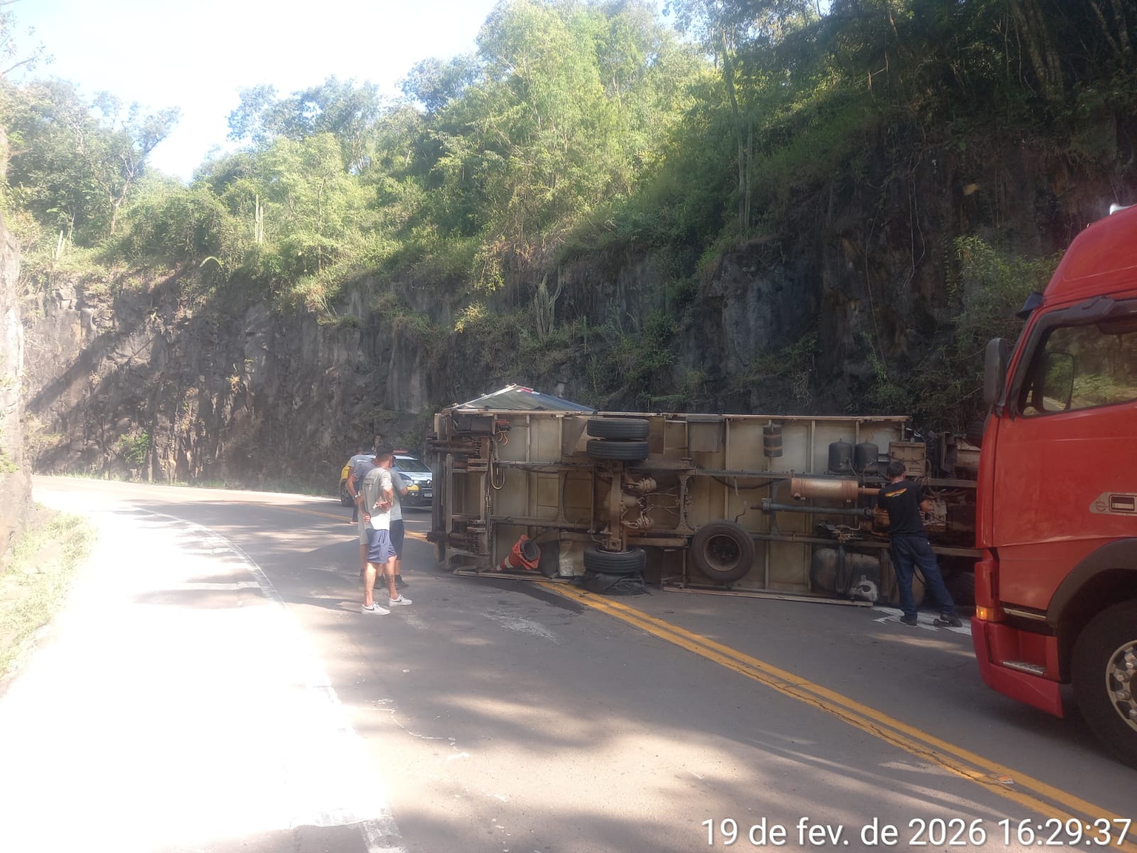 Parte da carga — composta por material escolar destinado ao Estado do Paraná — ficou espalhada sobre meia pista. Como o trecho possui curvas fechadas e o caminhão permaneceu parcialmente sobre a faixa de rolamento, a equipe policial realizou a sinalização do local até o destombamento do veículo por guincho.