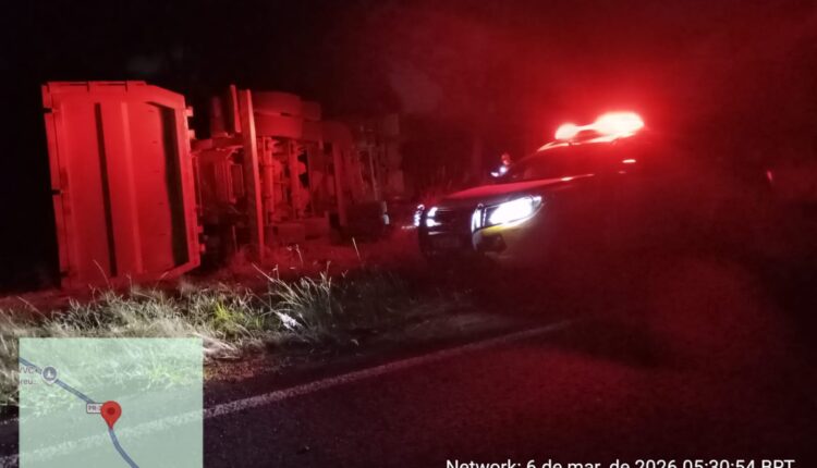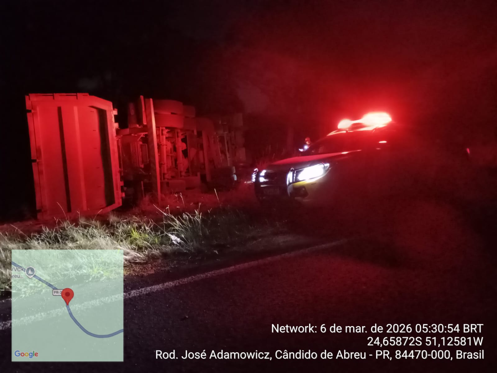 Candido de Abreu – Caminhão com placas de Castro tombou na madrugada de quinta-feira (05) na PR-239, no trecho entre Cândido de Abreu e Reserva, no Vale do Ivaí. O acidente aconteceu por volta das 2h30, na altura do km 265 + 700 metros, e não houve registro de vítimas no local.