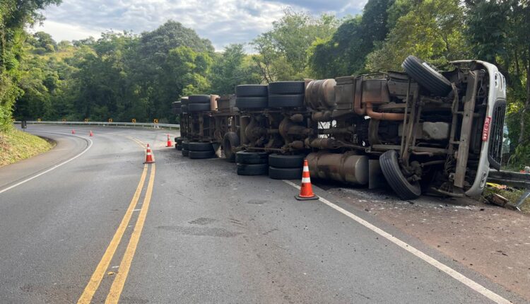 Caminhão de PG carregado de adubo capota na PRC-487 em Nova Tebas