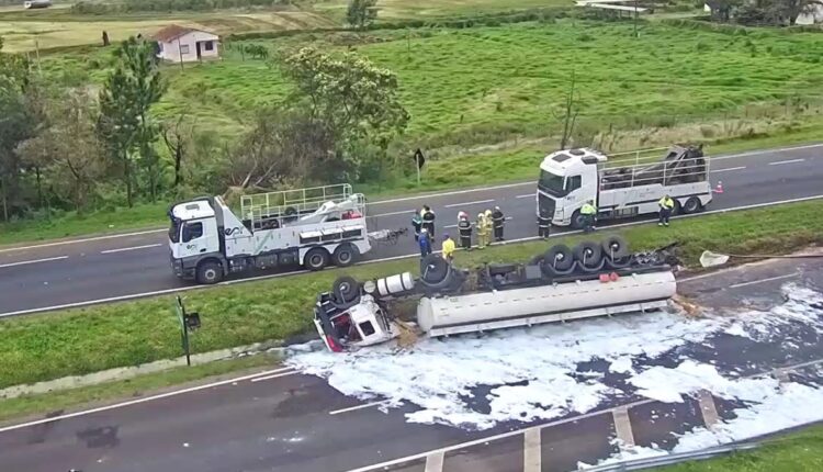 Caminhão-tanque tomba e mobiliza grande operação na PR-151, em Carambeí