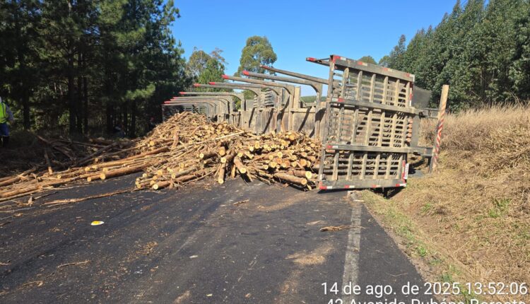 Caminhão tomba após estouro de pneu e interdita PR-239 por mais de quatro horas em Arapoti