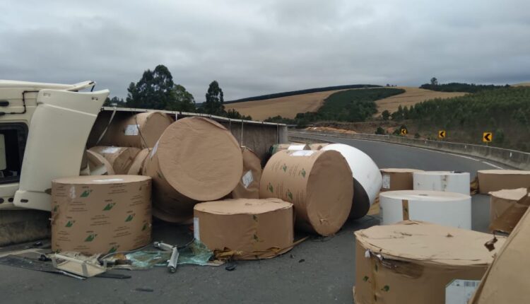 Jaguariaíva – Um caminhão Volvo FH 540, acoplado a um semi-reboque, tombou na tarde desta segunda-feira (16) sobre o viaduto da PR-151, no trecho entre os acessos I e II de Jaguariaíva. O acidente aconteceu por volta das 12h20, quando o veículo, que havia saído da PR-092 e contornava o viaduto em direção a Sengés, perdeu o controle e tombou, espalhando sua carga de bobinas de papel sobre a estrutura.
