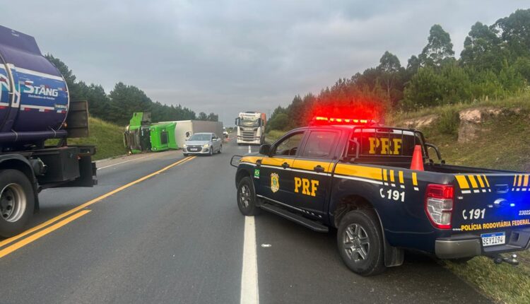 Porto Amazonas – Caminhão Scania 450, atrelado a uma carreta carregada com sete toneladas de produtos diversos, saiu da pista e tombou no quilômetro 158 da BR-277, em Porto Amazonas, na manhã desta quarta-feira (2).