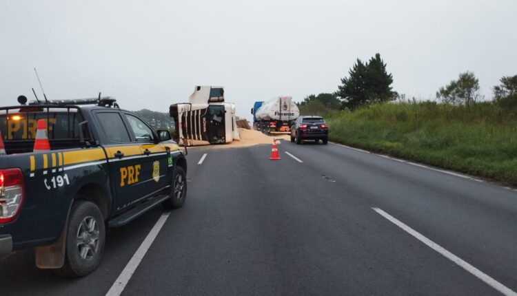 Palmeira – Caminhão carregado com farelo de soja tombou na madrugada desta quarta-feira (19) no km 550 da BR-376, em Palmeira. O acidente ocorreu por volta das 4h50, quando o veículo, que seguia no sentido Curitiba, atravessou a rodovia e tombou na pista contrária, no sentido Ponta Grossa.