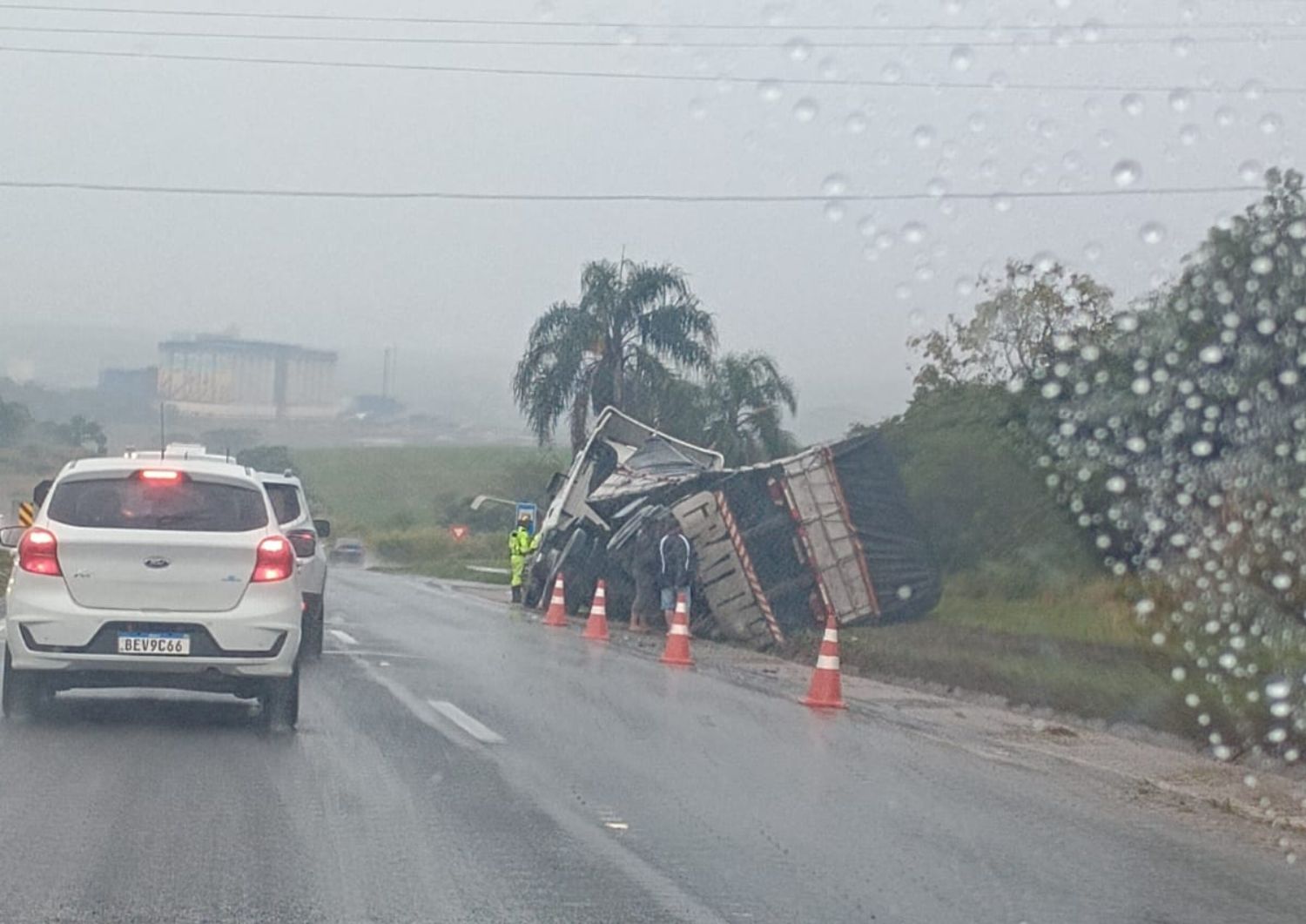 Caminhão tomba na lateral da pista em trecho da PR-151, entre Carambeí e Ponta Grossa