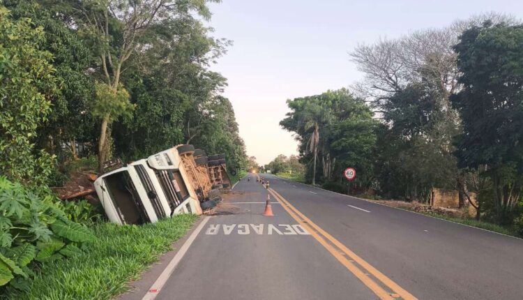 Caminhão tomba na PR-090 em Curiúva e motorista fica ferido