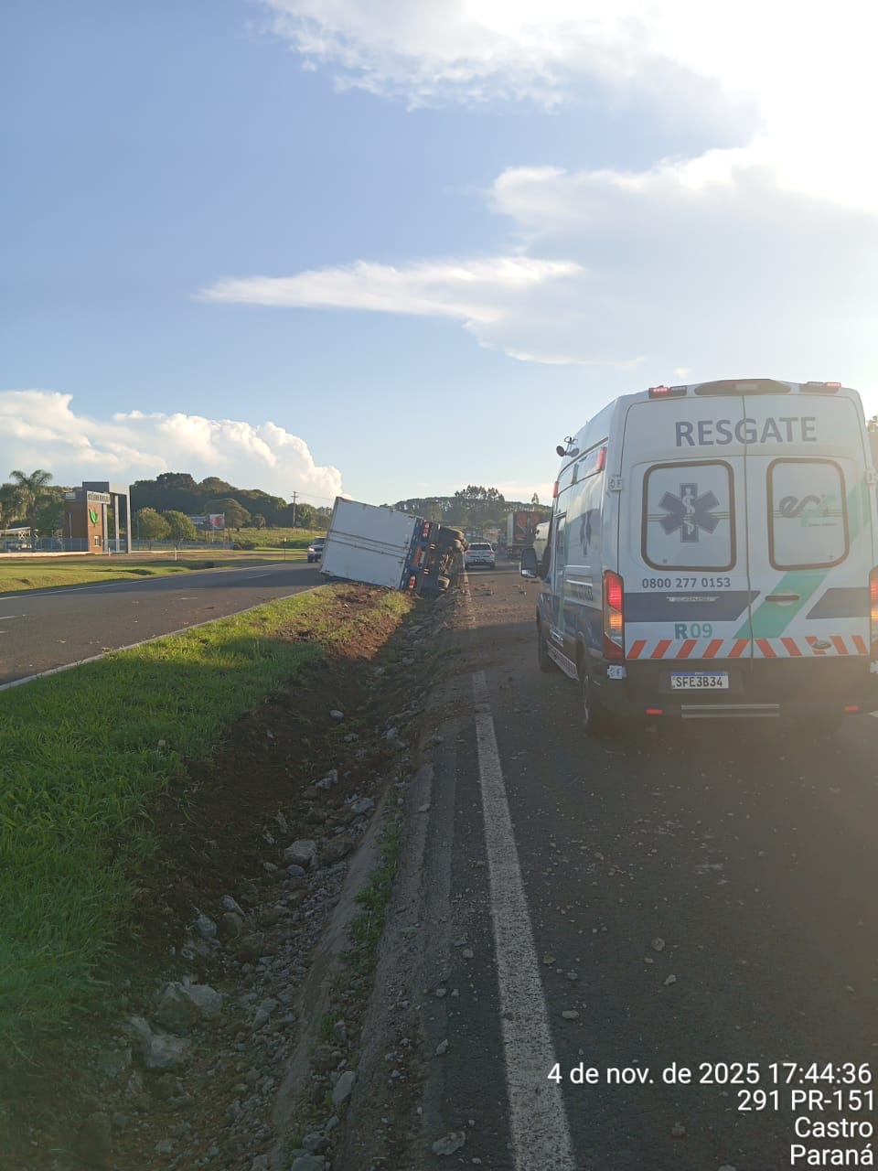 De acordo com informações da 5ª Companhia do Batalhão de Polícia Rodoviária (BPRv), o veículo trafegava sentido Castro–Carambeí quando, por motivos ainda não informados, o condutor perdeu o controle e acabou tombando na pista. O caminhão estava acoplado a um semirreboque Facchini, também de Maringá.