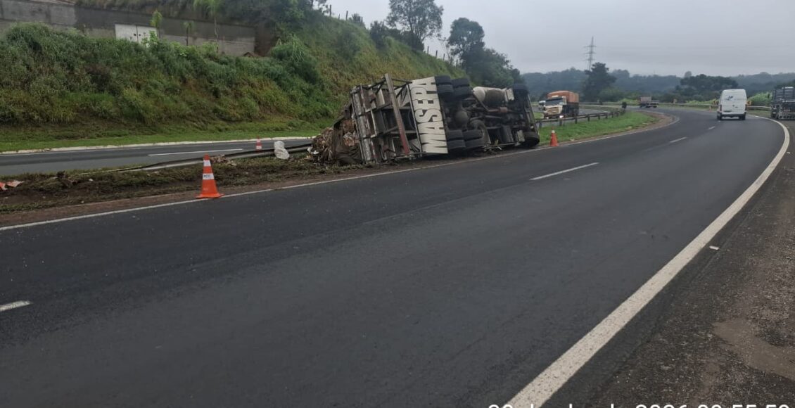 Caminhão tomba na PR-151 entre Piraí do Sul e Castro e deixa passageira ferida