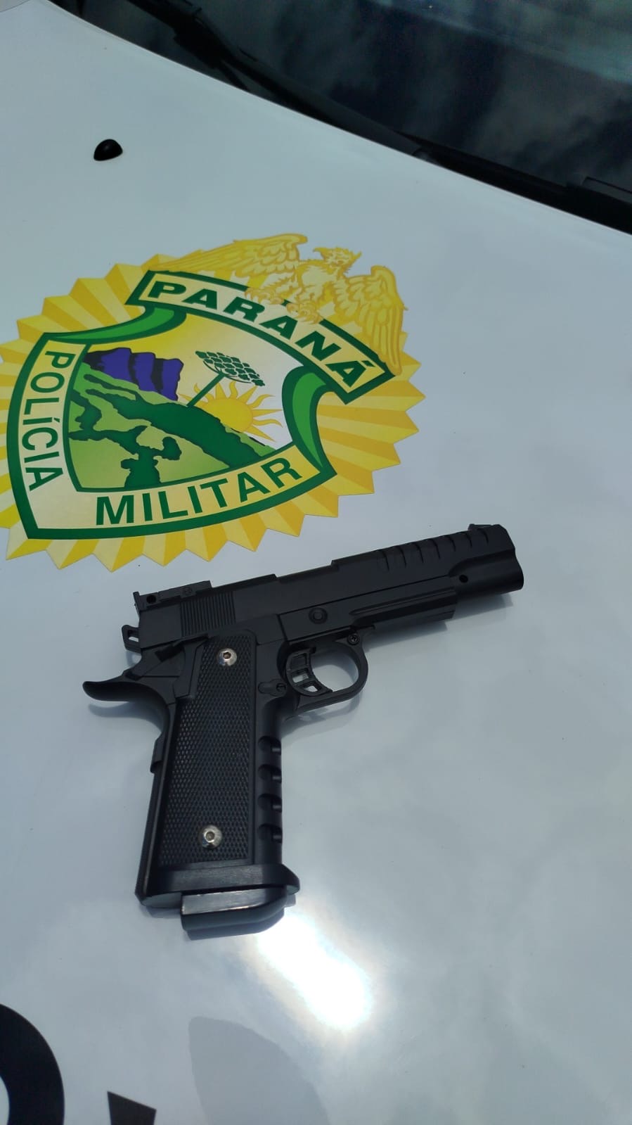 Com o suspeito preso, os policiais encontraram um simulacro de arma de fogo que teria sido utilizado para cometer o roubo. O detido foi encaminhado à Delegacia de Polícia para os procedimentos legais.