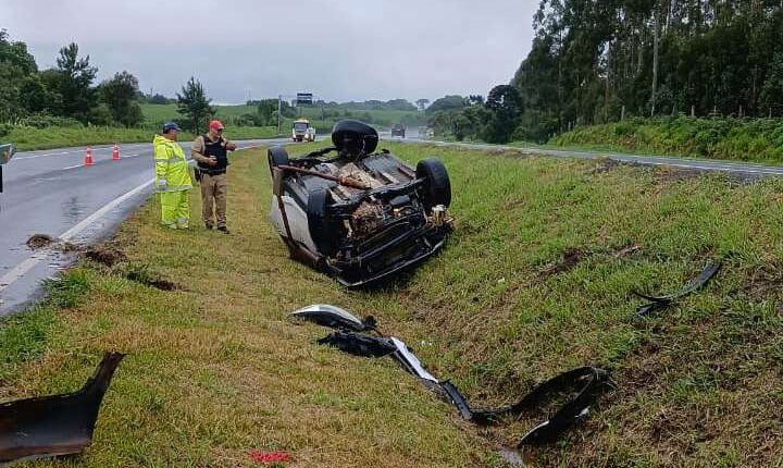 De acordo com a Polícia Rodoviária Estadual (PRE), o veículo seguia no sentido leste quando, por razões ainda não esclarecidas, perdeu o controle e capotou no canteiro central da rodovia. No carro estavam duas pessoas: a condutora, identificada como J.P., de 29 anos, e um passageiro, W.G., de 30 anos. Ambos sofreram ferimentos leves e foram encaminhados ao Hospital Geral Unimed (HGU) em Ponta Grossa para avaliação médica.