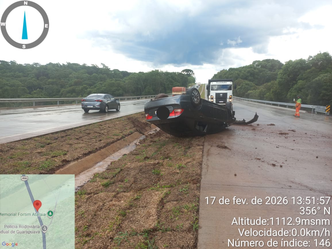 Guarapuava – Capotamento registrado na tarde desta terça-feira (17) na PRC-466, em Guarapuava, terminou sem vítimas, segundo a Polícia Rodoviária Estadual (PRE). O sinistro aconteceu por volta das 13h30, no km 251 + 200 metros, no trecho entre o distrito de Palmeirinha e a BR-277.