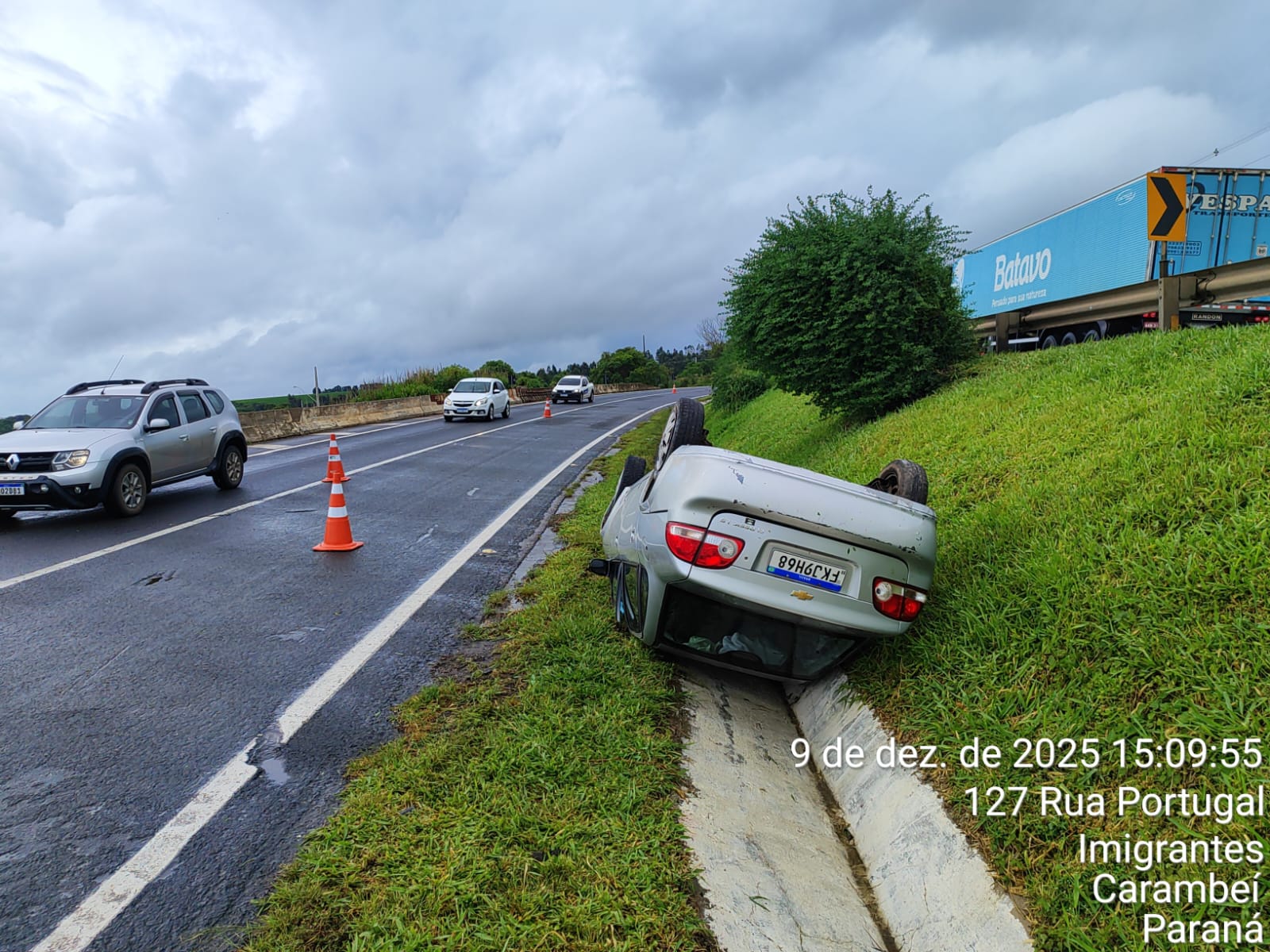 O veículo envolvido, um Chevrolet Classic de Piraí do Sul, era conduzido por uma mulher de 39 anos, que não se feriu. Duas passageiras, de 7 e 12 anos, sofreram ferimentos leves e foram encaminhadas para avaliação médica na UPA Santa Paula. O carro teve danos após o capotamento.