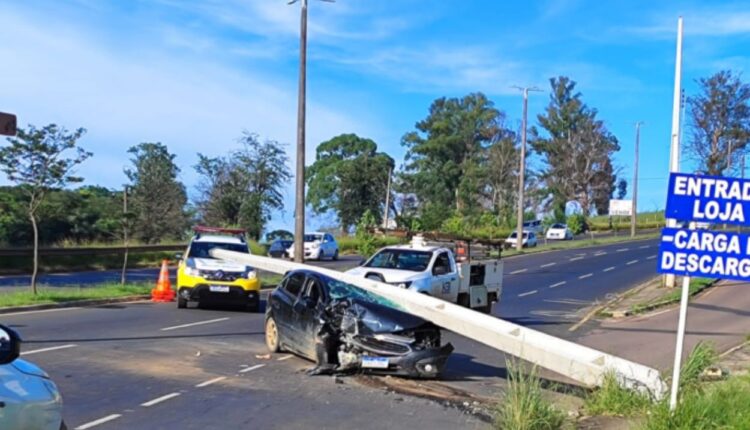 Na madrugada, um veículo colidiu violentamente contra um poste no sentido Centro-bairro, próximo à entrada do Supermercado Atacadão. Com o impacto, a estrutura foi derrubada, bloqueando parcialmente a pista e afetando o tráfego na região.