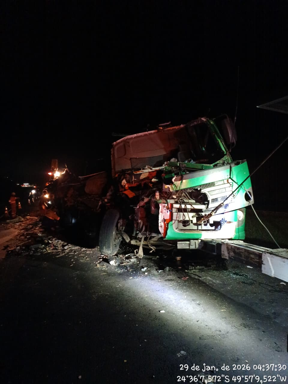 De acordo com a PRE, o sinistro foi classificado como abalroamento longitudinal e envolveu dois veículos de carga. O primeiro, um caminhão VW 30.330, de cor verde, com placas de Guarapuava, era conduzido por um homem não identificado, que não sofreu ferimentos. O segundo veículo envolvido foi um caminhão Scania, de cor branca, com placas de Marau, no Rio Grande do Sul, conduzido por J. T. S., de 69 anos, que também saiu ileso.