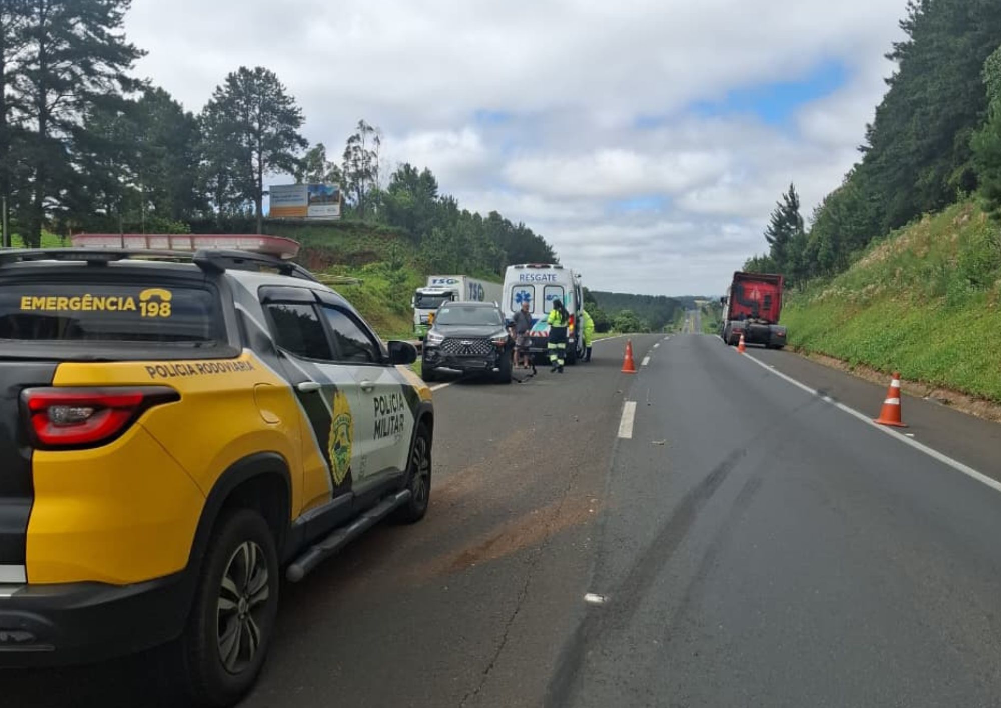 De acordo com a PRE, o acidente aconteceu por volta das 9h15, no km 262 + 100 metros da rodovia, no trecho que liga Piraí do Sul a Castro. Estiveram envolvidos um caminhão Scania R440 Euro, com placas de Campos Novos Parecis (MT), e um Caoa Chery Tiggo 5, emplacado em Foz do Iguaçu (PR).