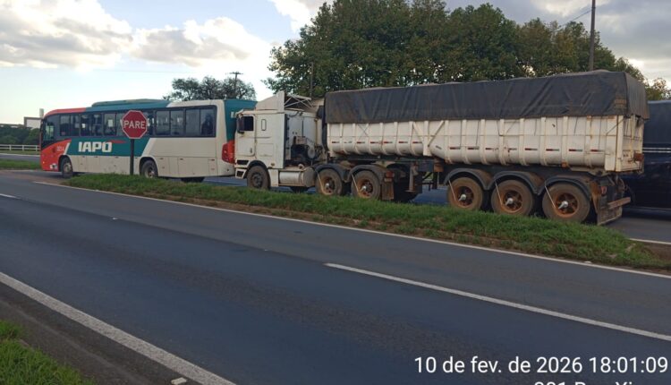 Acidente envolveu caminhão, semirreboque e ônibus no sentido Carambeí–Ponta Grossa; vítima teve ferimentos leves