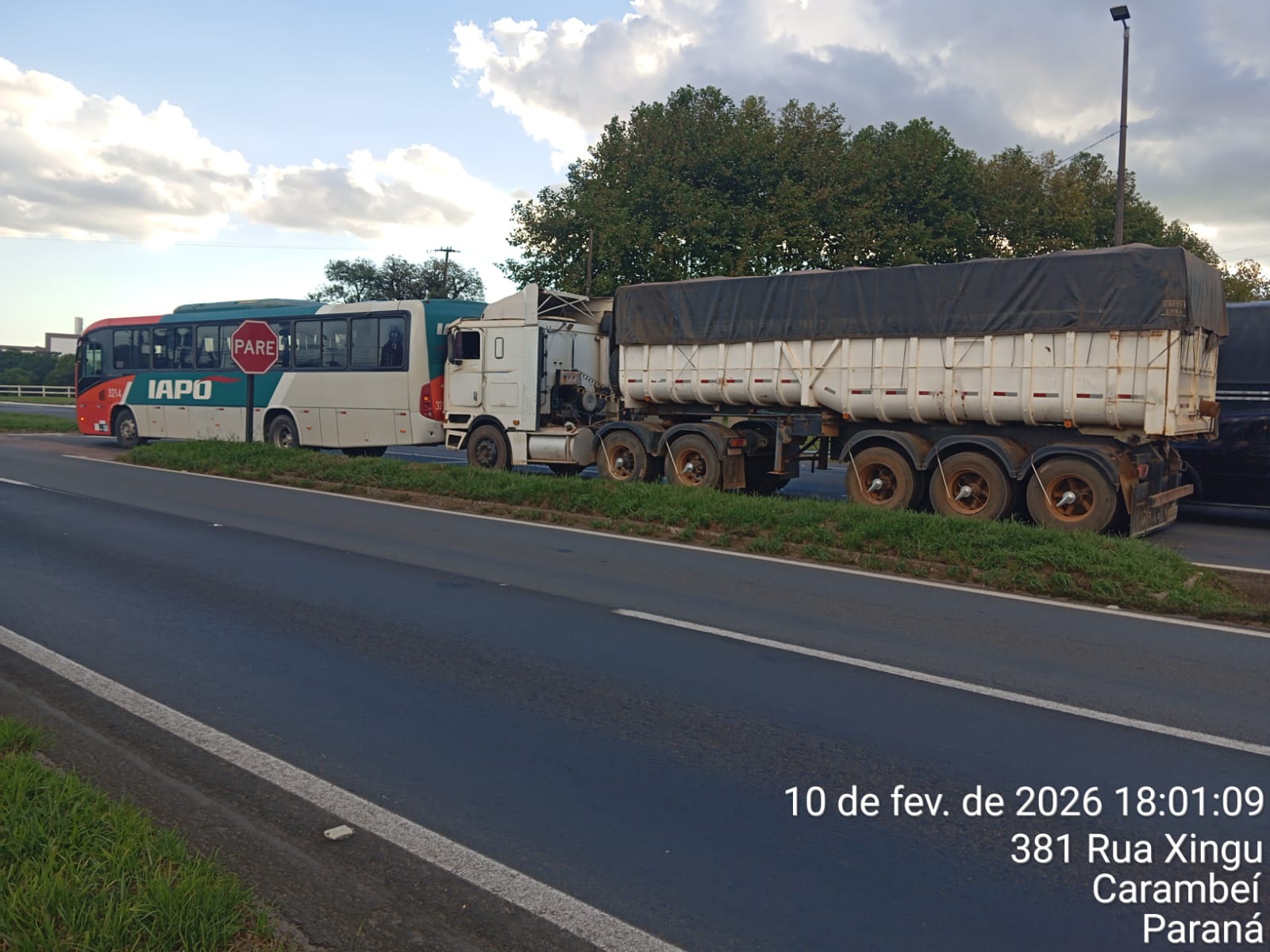 Segundo a PRE, o sinistro envolveu dois veículos: um caminhão Internacional, acoplado em um semirreboque Randon, ambos com emplacamento de Carambeí, e um ônibus VW/Marcopolo, com placas de Ponta Grossa. Os veículos trafegavam no sentido Carambeí–Ponta Grossa quando, ao atingir o trecho indicado, se envolveram na colisão traseira.