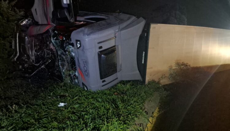 Colisão traseira na PR-151 em Castro deixa motorista ferido e provoca tombamento de caminhão