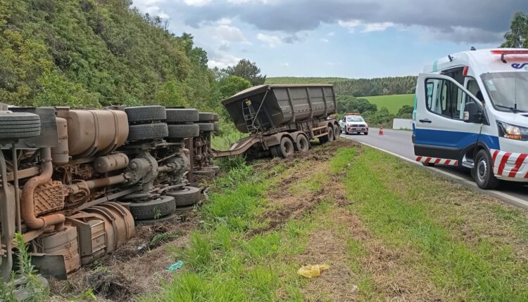 De acordo com o relato policial, o acidente ocorreu quando um caminhão Volvo FH 540, conduzido por L. C. C., de 54 anos, perdeu o controle e tombou parcialmente fora da pista após ser “fechado” por outro caminhão, um DAF com semirreboque, dirigido por J. A., de 37 anos. Nenhum dos motoristas sofreu ferimentos.