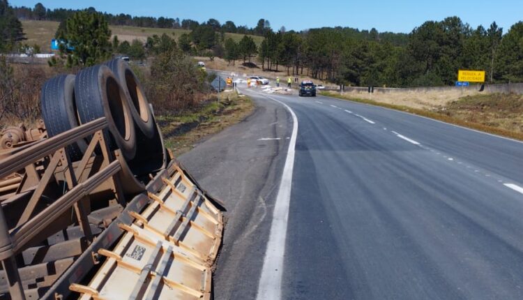 Praticamente no mesmo horário, no km 551, em Balsa Nova, no sentido a Ponta Grossa, carreta carregada com adubo tombou. O condutor também não se feriu, mas parte da carga foi derramada sobre a pista. Neste ponto, a faixa da esquerda está interditada, enquanto a direita permanece aberta. A retirada da carga está sob responsabilidade da concessionária que administra a rodovia, que já está no local realizando a retirada. A PRF orienta motoristas a redobrarem a atenção ao trafegar pelo trecho, que registra fluxo lento nos dois sentidos.