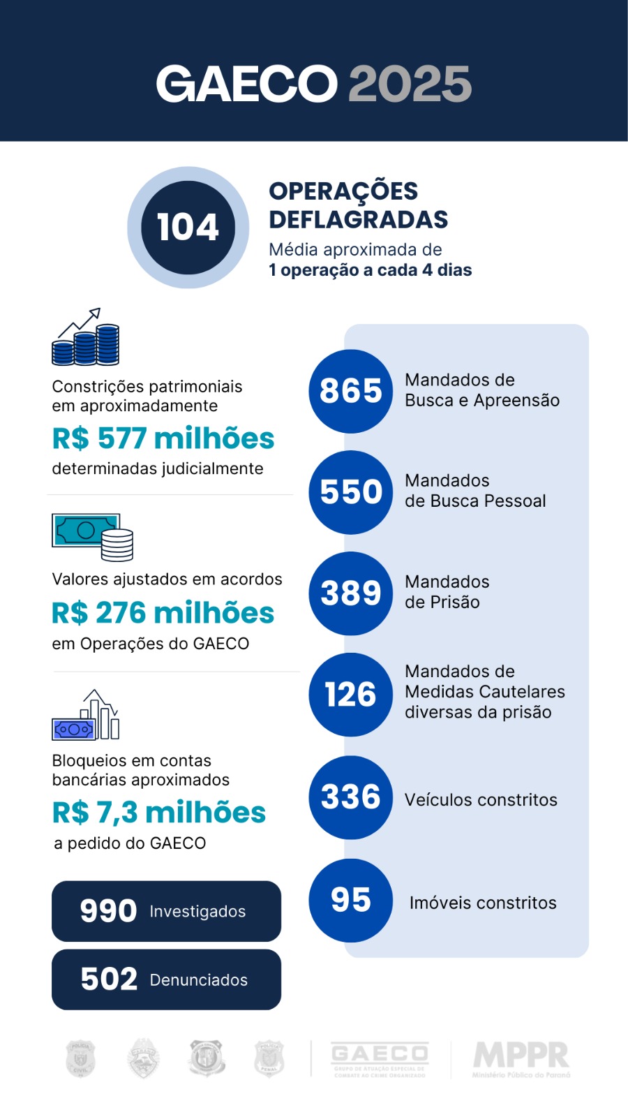 Curitiba – Durante o ano de 2025, 104 operações foram deflagradas pelos dez núcleos regionais do Grupo de Atuação Especial de Combate ao Crime Organizado (Gaeco), do Ministério Público do Paraná (MPPR) — ou seja, em média, uma operação foi realizada a cada 3,5 dias. No âmbito desses trabalhos, foram cumpridos 865 mandados de busca e apreensão, 550 de busca pessoal, 389 de prisão e 126 medidas cautelares diversas da prisão.