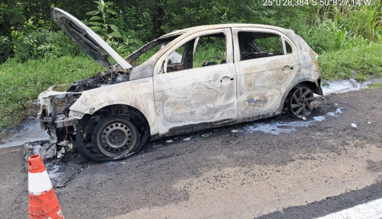 Carambeí – Veículo VW Gol ficou totalmente incendiado na manhã deste domingo (23) na PR-151, em Carambeí. O sinistro ocorreu por volta das 8h, no km 317+700 da rodovia, no trecho entre o acesso à PRC-373 e o município.