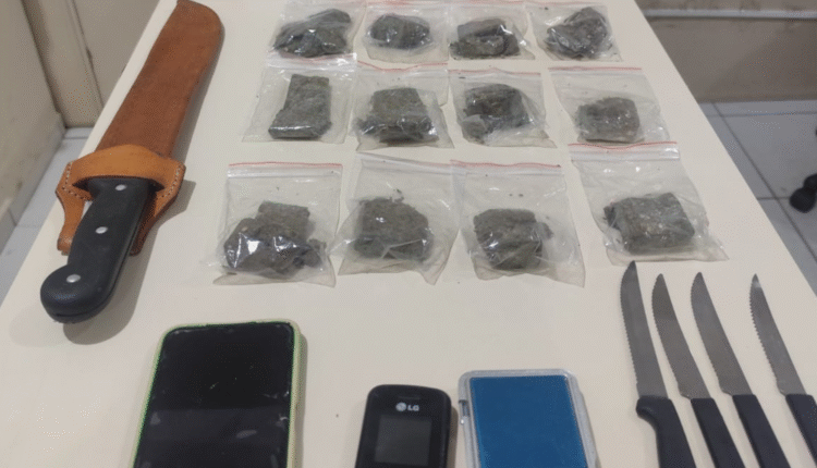 Com autorização dos moradores, os policiais entraram no imóvel e localizaram o suspeito em um dos quartos. No local, foi encontrado o facão utilizado nas ameaças. Durante a abordagem, os agentes também visualizaram uma mochila contendo aproximadamente 302 gramas de substância análoga à maconha, fracionada em oito porções.