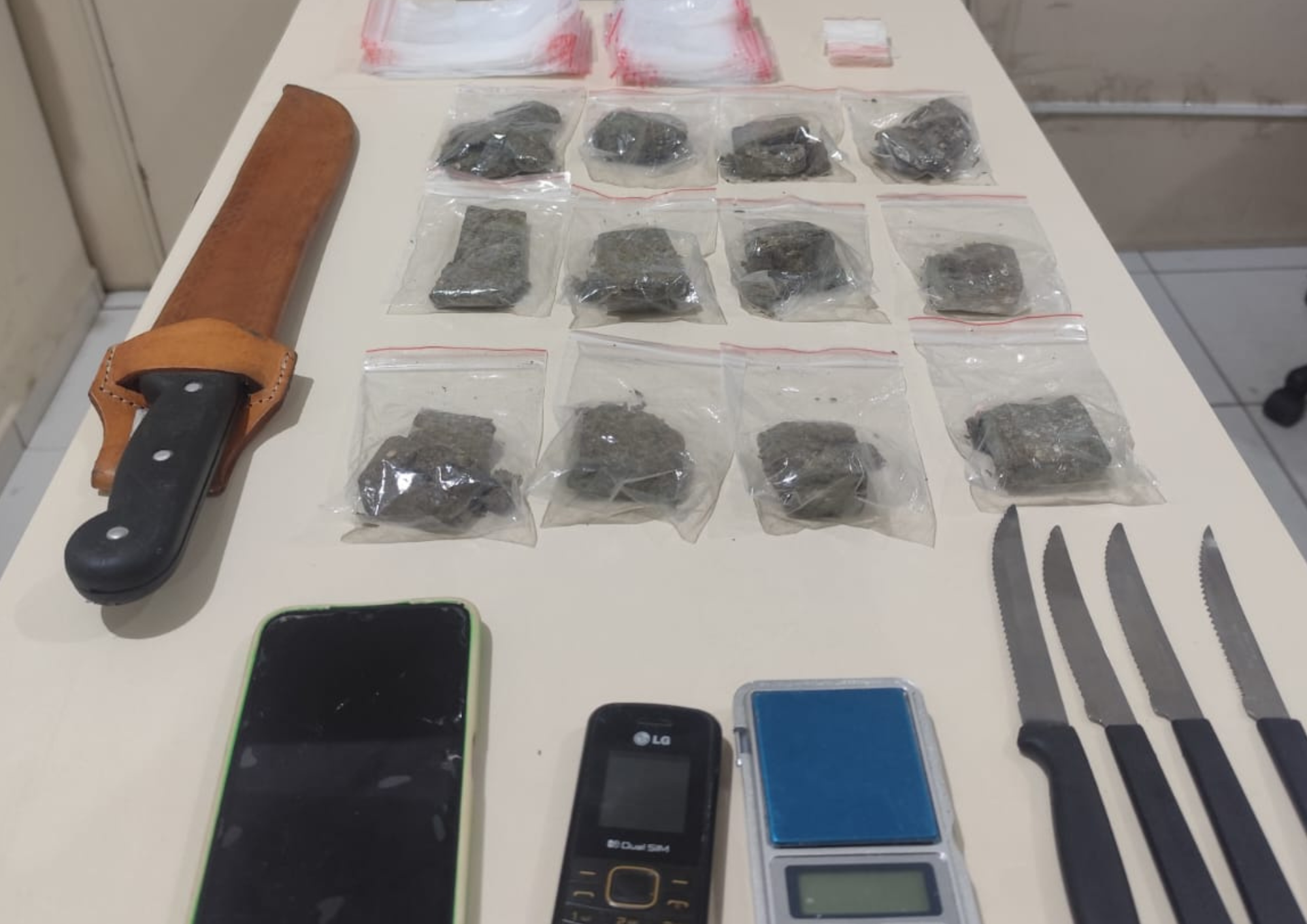 Em buscas complementares, foram localizados invólucros plásticos utilizados para embalar drogas e uma balança de precisão, indicando a prática de tráfico de entorpecentes.