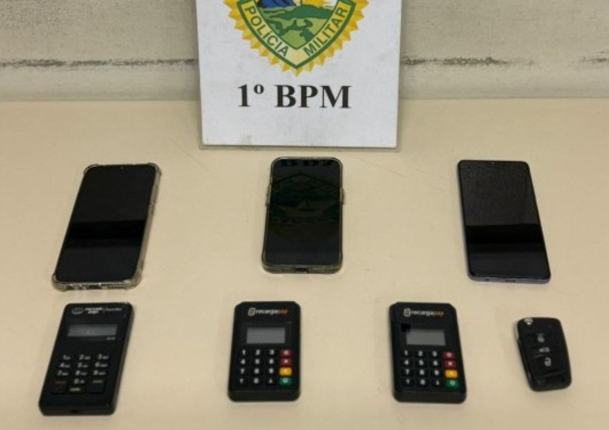 Durante a abordagem, nada de ilícito foi encontrado com o suspeito, mas no interior do carro os policiais localizaram diversos produtos semelhantes aos usados no golpe — incluindo jogos de cama, uma parafusadeira, três máquinas de cartão e três celulares.