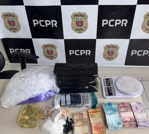 Os agentes cumpriram um mandado de busca e apreensão em uma residência do município e localizaram entorpecentes escondidos em compartimentos falsos de uma mesa e de uma gaveta. No local foram apreendidas porções de cocaína e crack, além de seis “tijolos” de maconha, balança de precisão, materiais para embalar as drogas e R$ 2.039 em dinheiro.