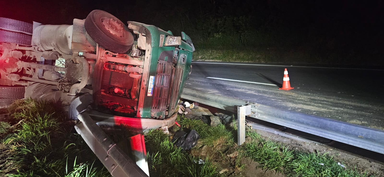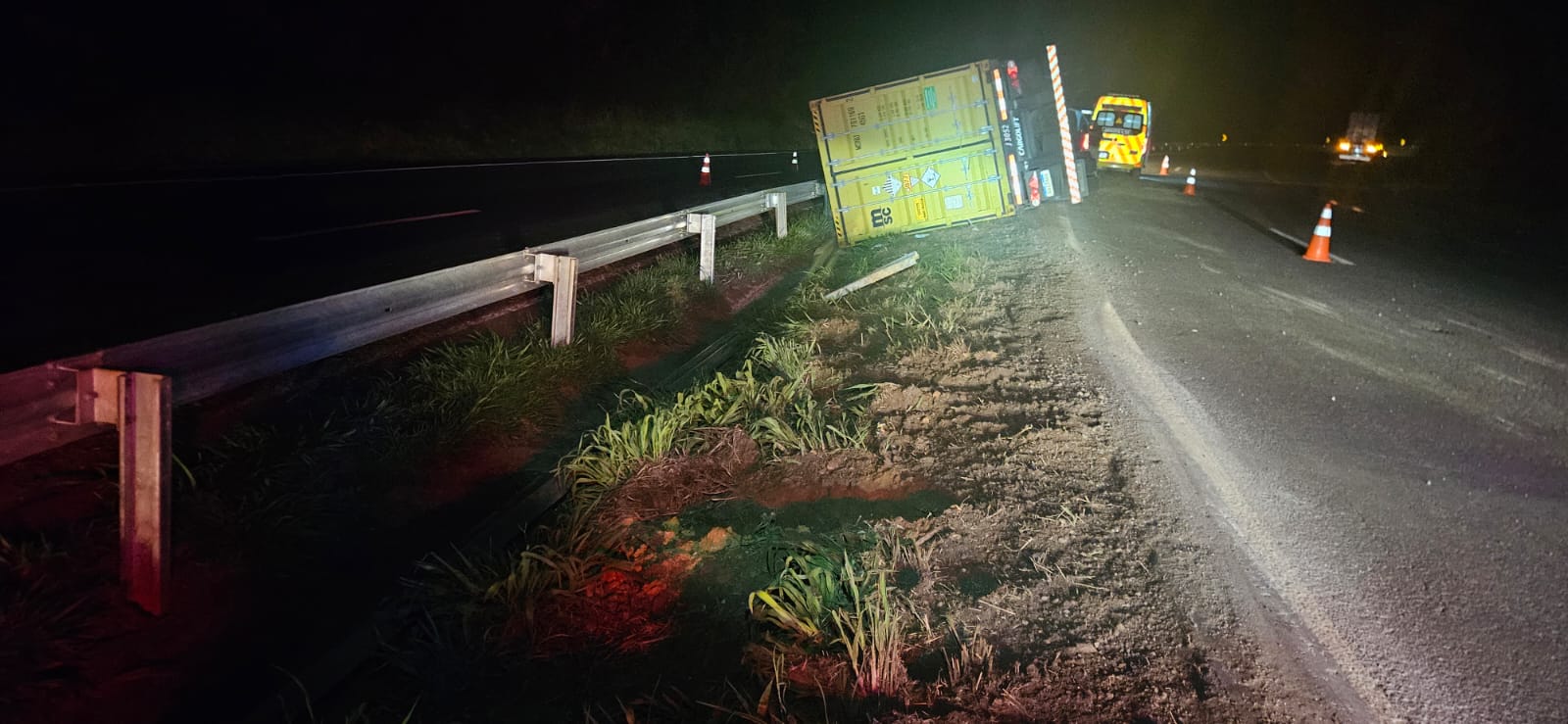 De acordo com a corporação, o veículo envolvido é um caminhão-trator Volvo FH 440, emplacado em São José dos Pinhais (PR), que tracionava um semirreboque carregado com defensivos agrícolas. Apesar do tombamento, o contêiner não se abriu e a carga permaneceu intacta.