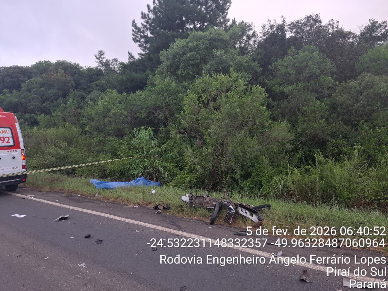 Segundo o relato da equipe policial que atendeu a ocorrência, a motocicleta seguia pela PR-090 no sentido Piraí do Sul a Ventania, quando, ao se aproximar do km 156+600m, acabou sendo atingida lateralmente pelo automóvel, que trafegava no sentido oposto e realizava uma ultrapassagem no momento da colisão.