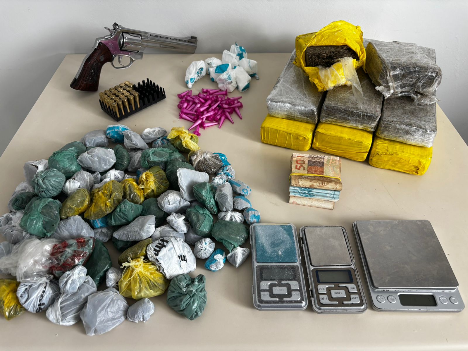 As equipes apreenderam 6,970 quilos de maconha, 269 gramas de cocaína, 36 pedras de crack, além de cinco armas, 37 munições de calibre .38, oito balanças de precisão, uma motocicleta e R$ 7.336,00 em espécie. Também foram encontrados diversos objetos provenientes de furtos ocorridos recentemente na cidade.