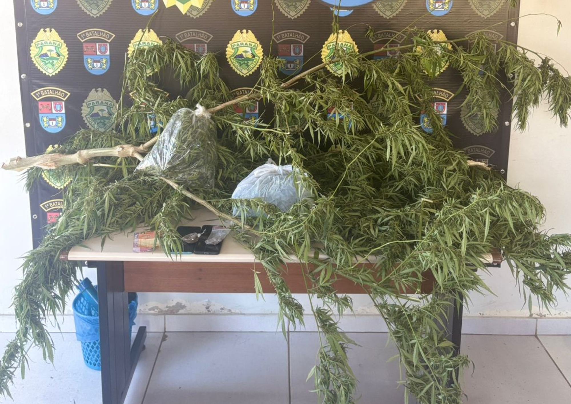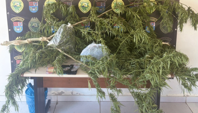 Em continuidade às buscas na residência, os policiais localizaram um pé de maconha com aproximadamente 1,90 metro de altura, além de cerca de 650 gramas de flores da mesma substância, mais 10 gramas adicionais e uma quantia em dinheiro.
