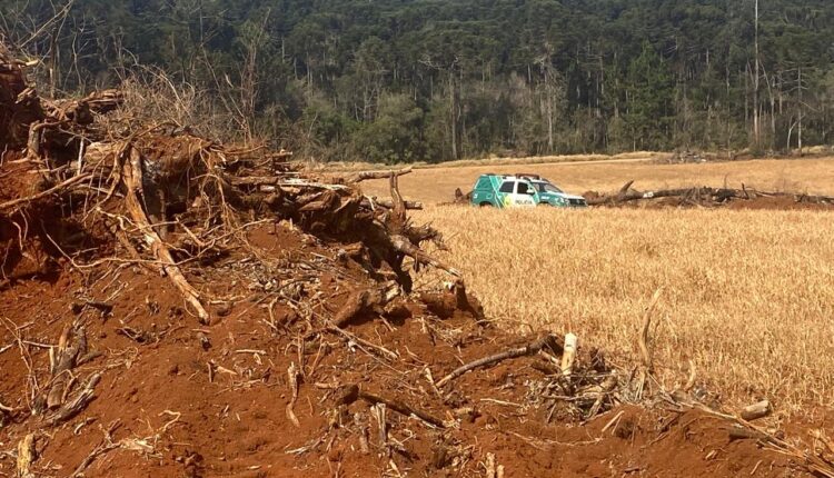 Durante a vistoria, os policiais constataram a destruição de 4,87 hectares de floresta em estágio médio de regeneração do bioma Mata Atlântica, ocasionada pela destoca de espécies nativas.